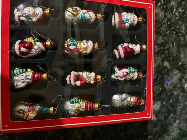 Fur sets of holiday ornaments, $10 each. Most are all glass, not plastic.
