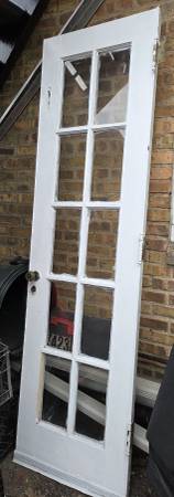 All glass panels are intact, and the door includes its original hinges and old hardware (knob and latch area) still attached.