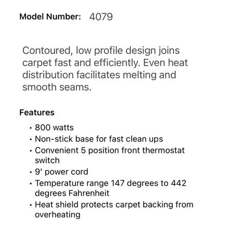 For sale: barely used 800 watt carpet seaming iron. I bought this for a small DIY basement carpet installation job, and will never need it again. Asking $45 Located in the downtown Chelsea area, and...